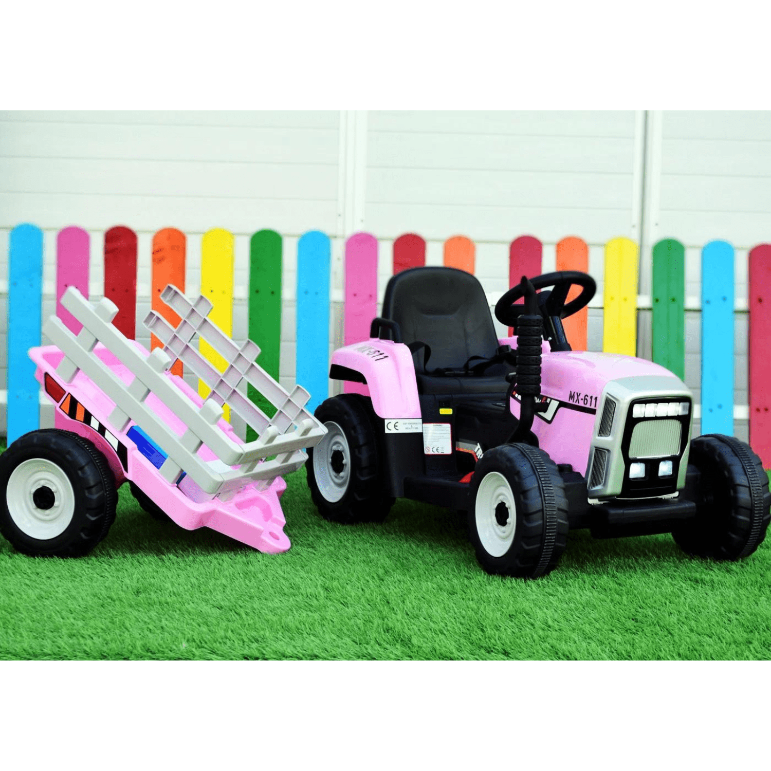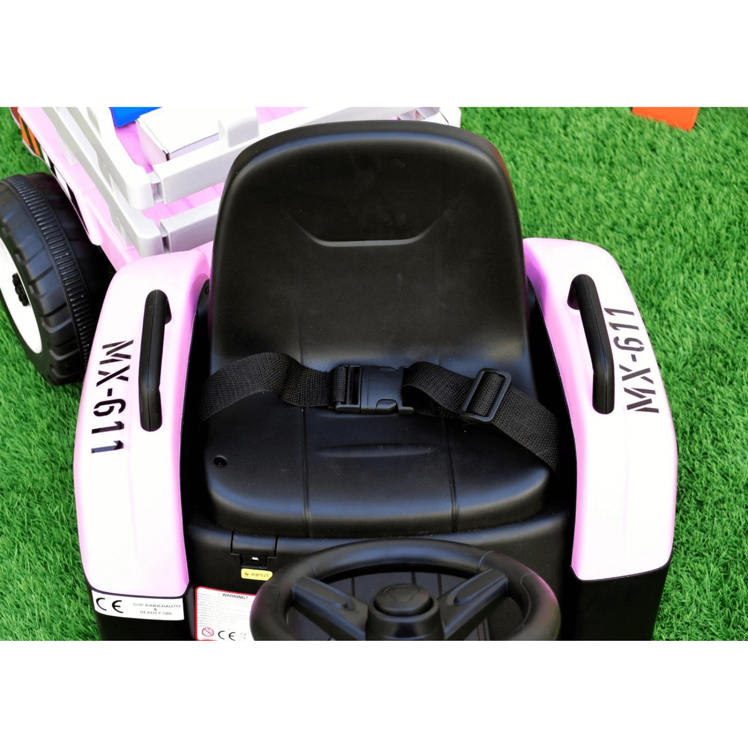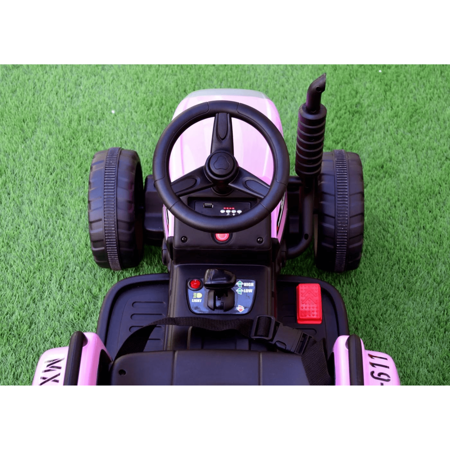 Тракторът може да се управлява и ръчно от детето чрез волан, оборудван с бутони за активиране на звукови ефекти.