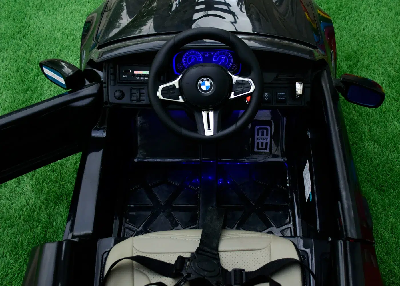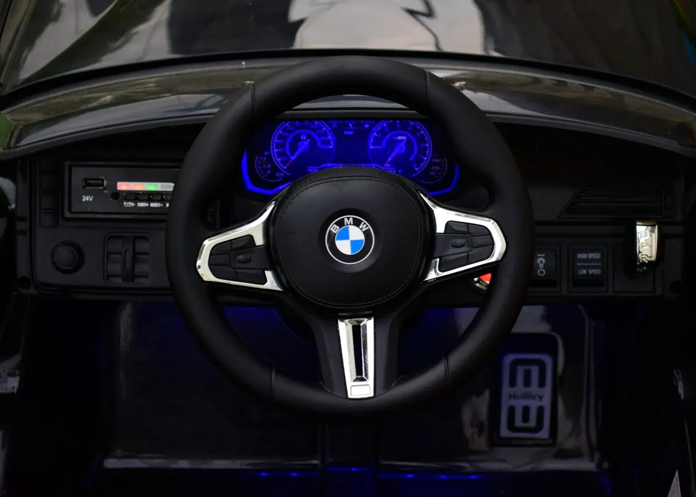 Аудио: 24 V MP3 плейър с USB, MiniSD, Bluetooth; волан с контрол на музика и клаксон; стартиращи звукови ефекти
